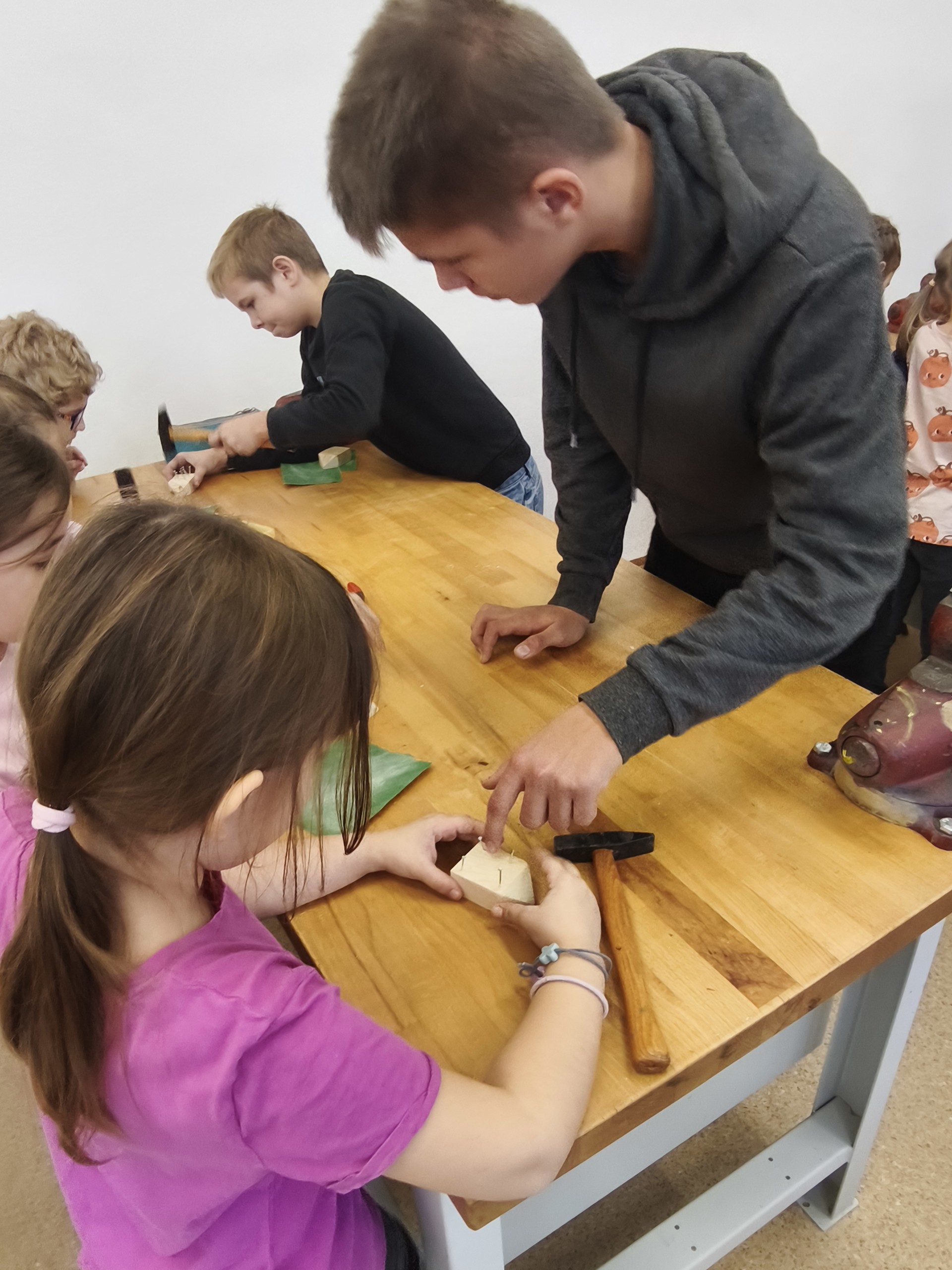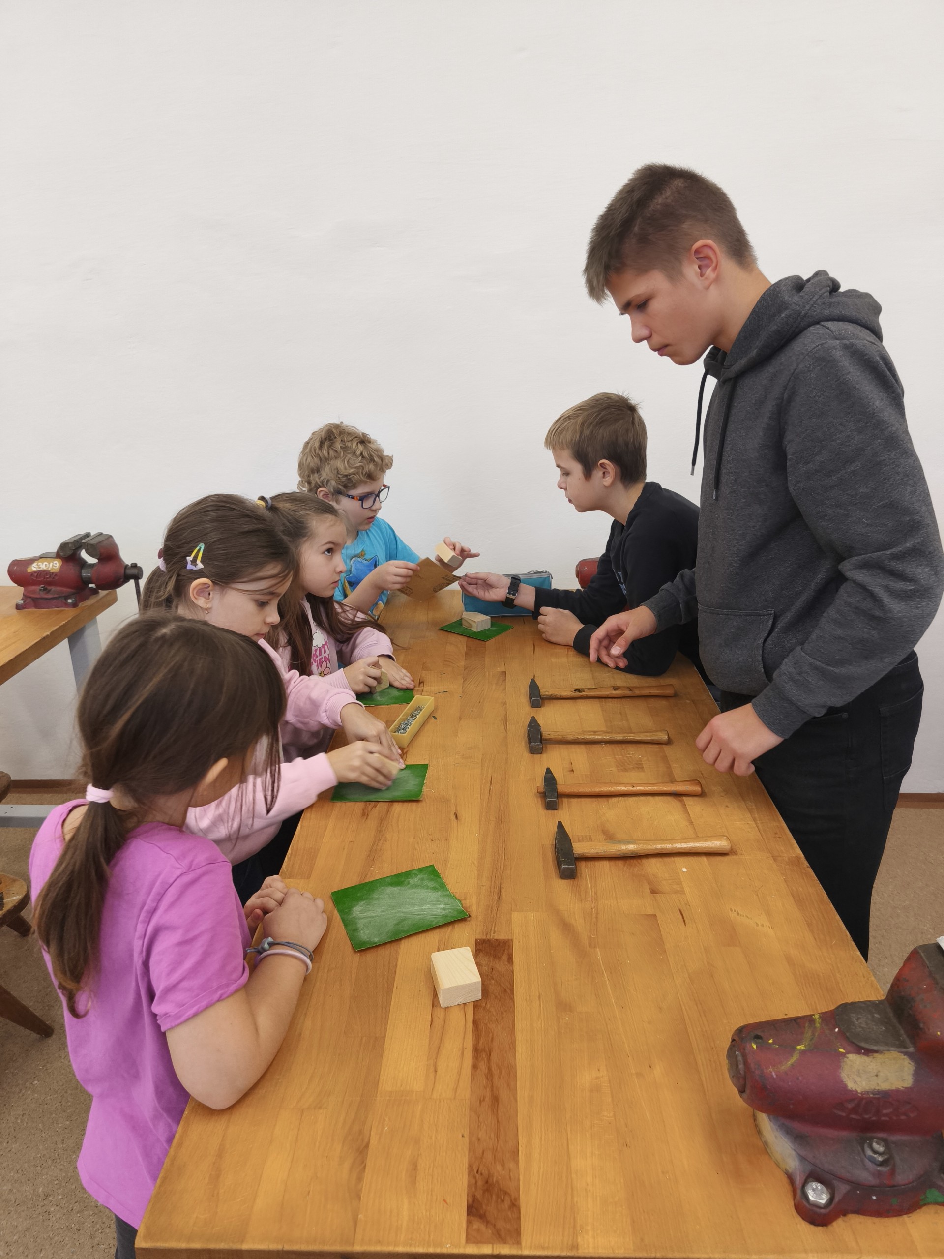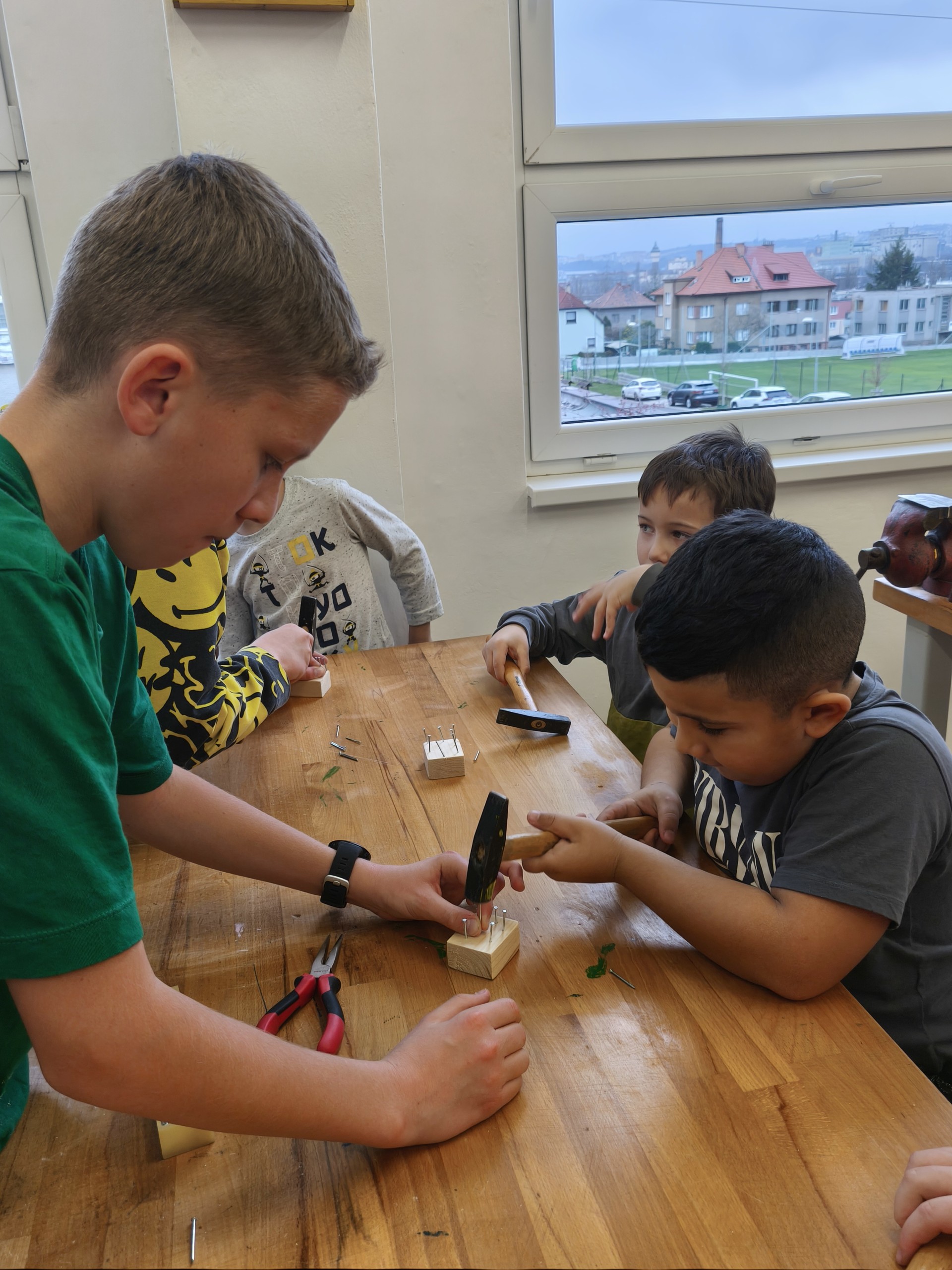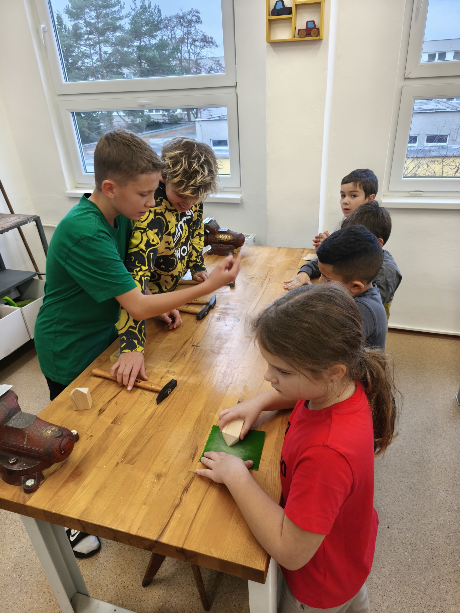 Děti pracovaly v menších skupinkách, zhruba čtyři až pět prvňáků na dva až tři sedmáky. Toto propojené vyučování žáků různých tříd se opět ukázalo jako velmi přínosné – starší žáci trpělivě vysvětlovali, jak s nástroji bezpečně zacházet, pomáhali s obtížnějšími kroky a v případě potřeby hledali řešení drobných zádrhelů. Mladší děti se tak učily nejen technickým dovednostem, ale i tomu, jak si říct o pomoc, jak pracovat pečlivě a soustředěně a jak dokončit práci, i když je potřeba trochu více času či trpělivosti.