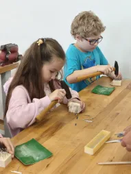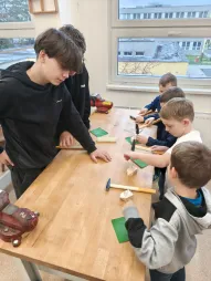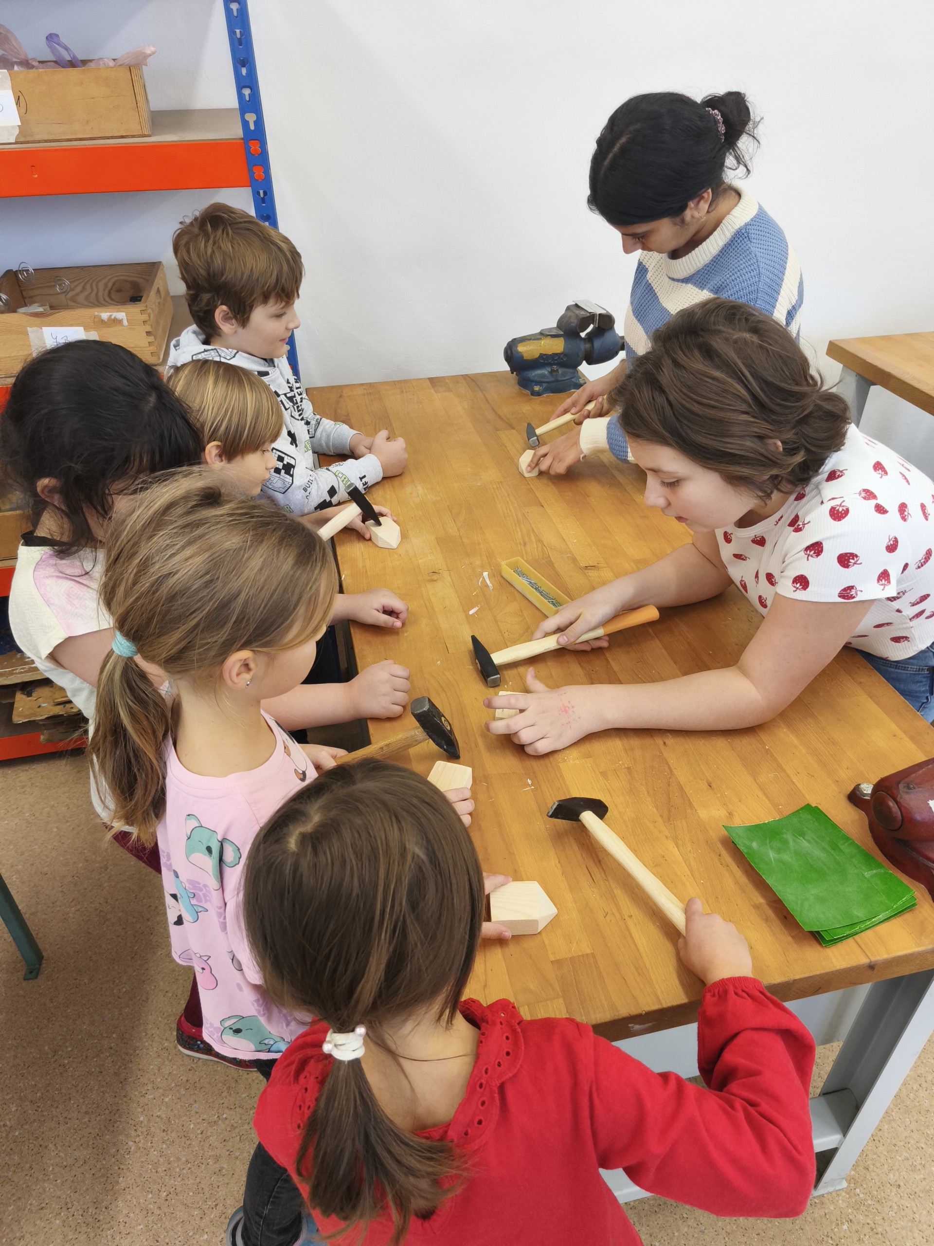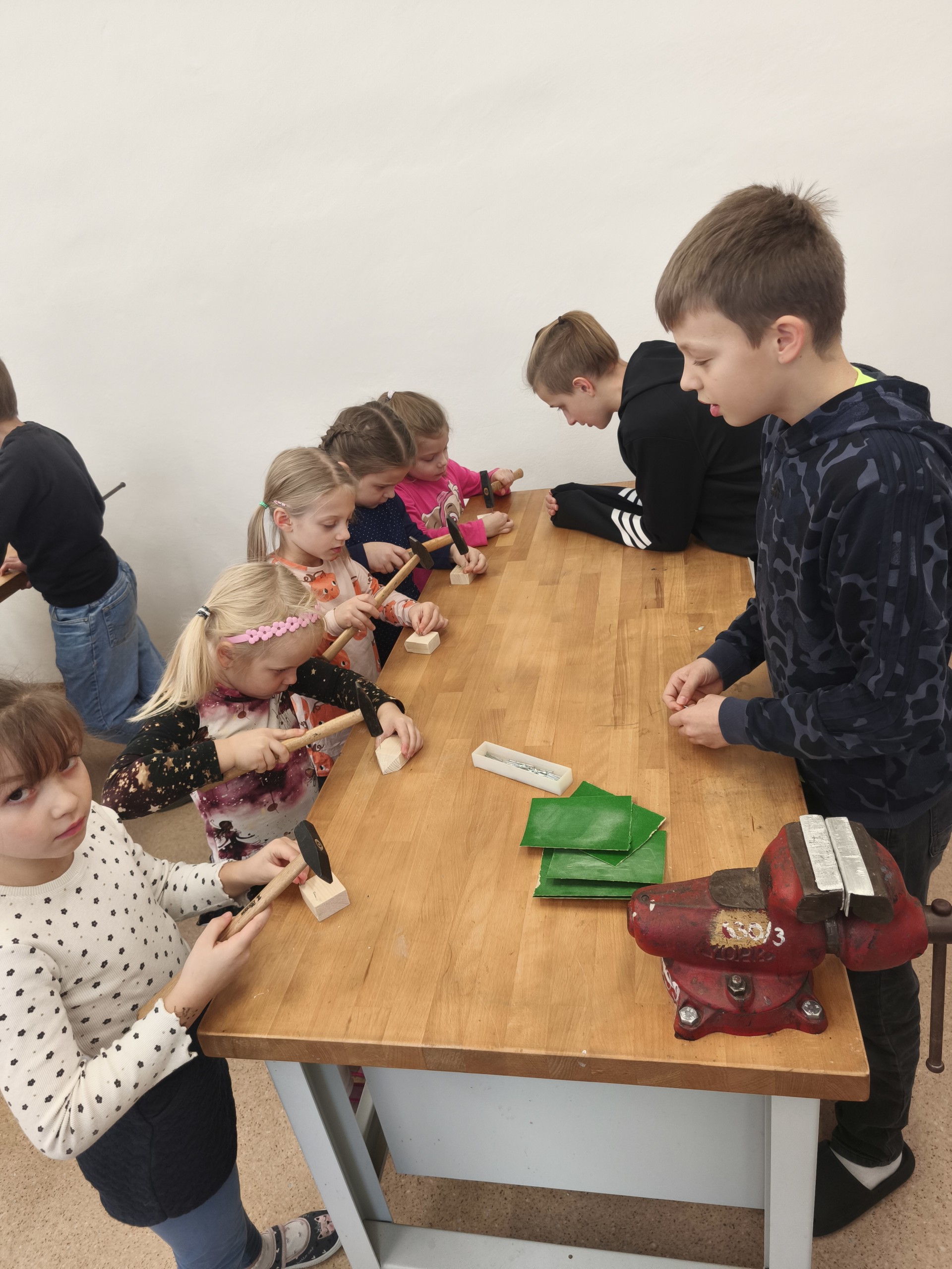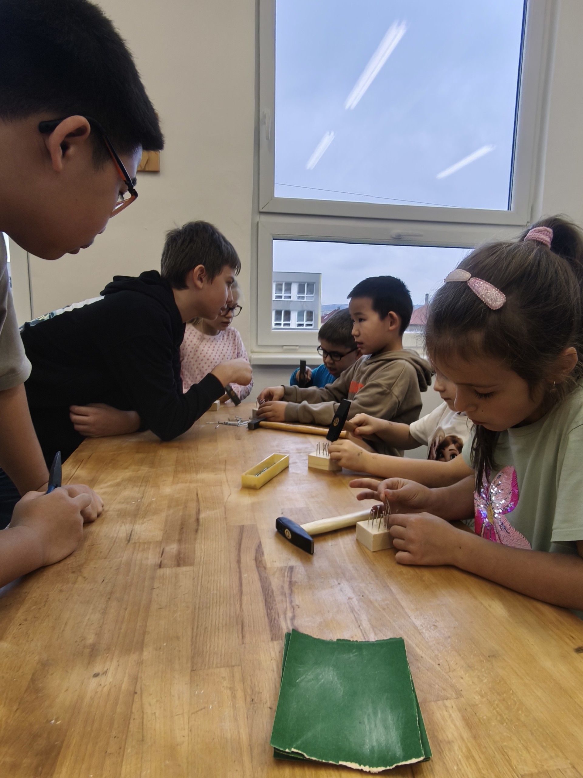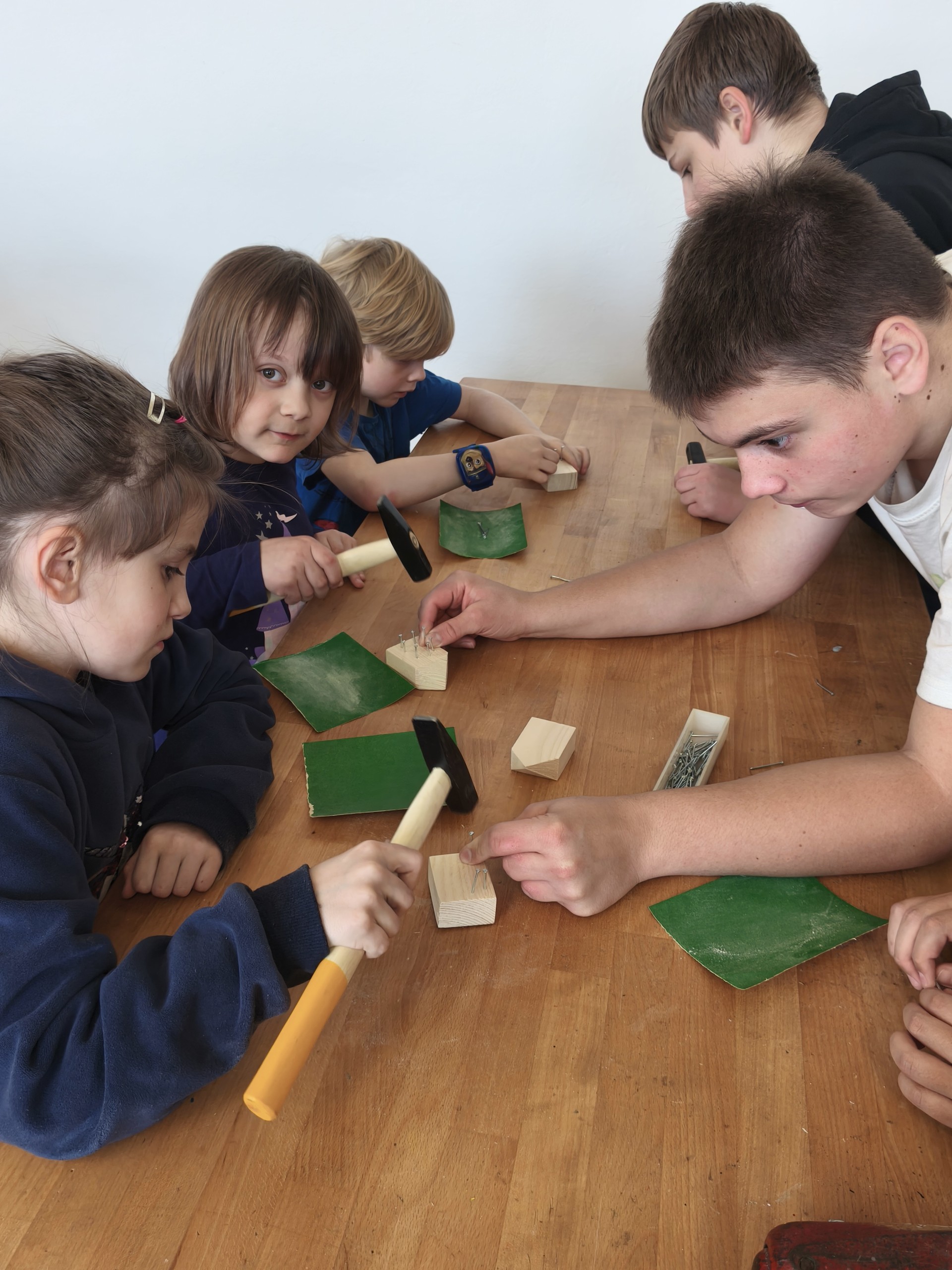 Děti pracovaly v menších skupinkách, zhruba čtyři až pět prvňáků na dva až tři sedmáky. Toto propojené vyučování žáků různých tříd se opět ukázalo jako velmi přínosné – starší žáci trpělivě vysvětlovali, jak s nástroji bezpečně zacházet, pomáhali s obtížnějšími kroky a v případě potřeby hledali řešení drobných zádrhelů. Mladší děti se tak učily nejen technickým dovednostem, ale i tomu, jak si říct o pomoc, jak pracovat pečlivě a soustředěně a jak dokončit práci, i když je potřeba trochu více času či trpělivosti.