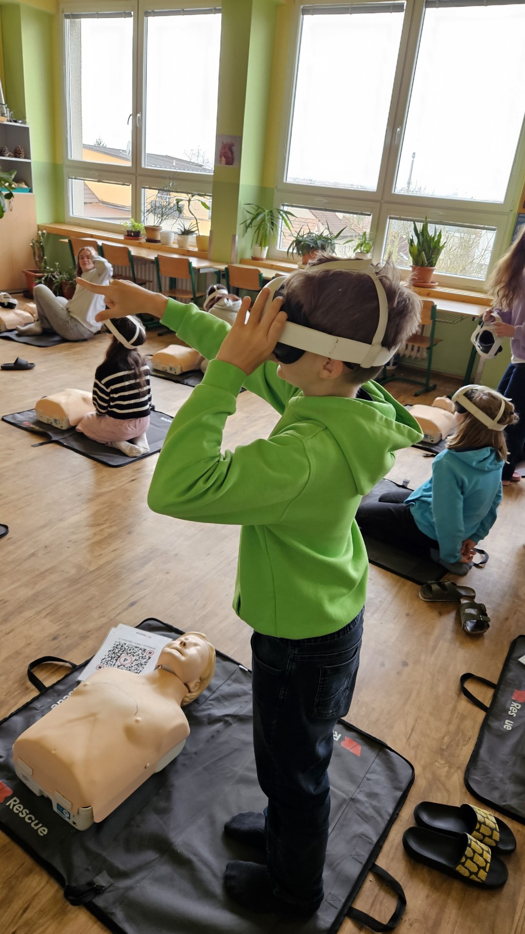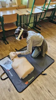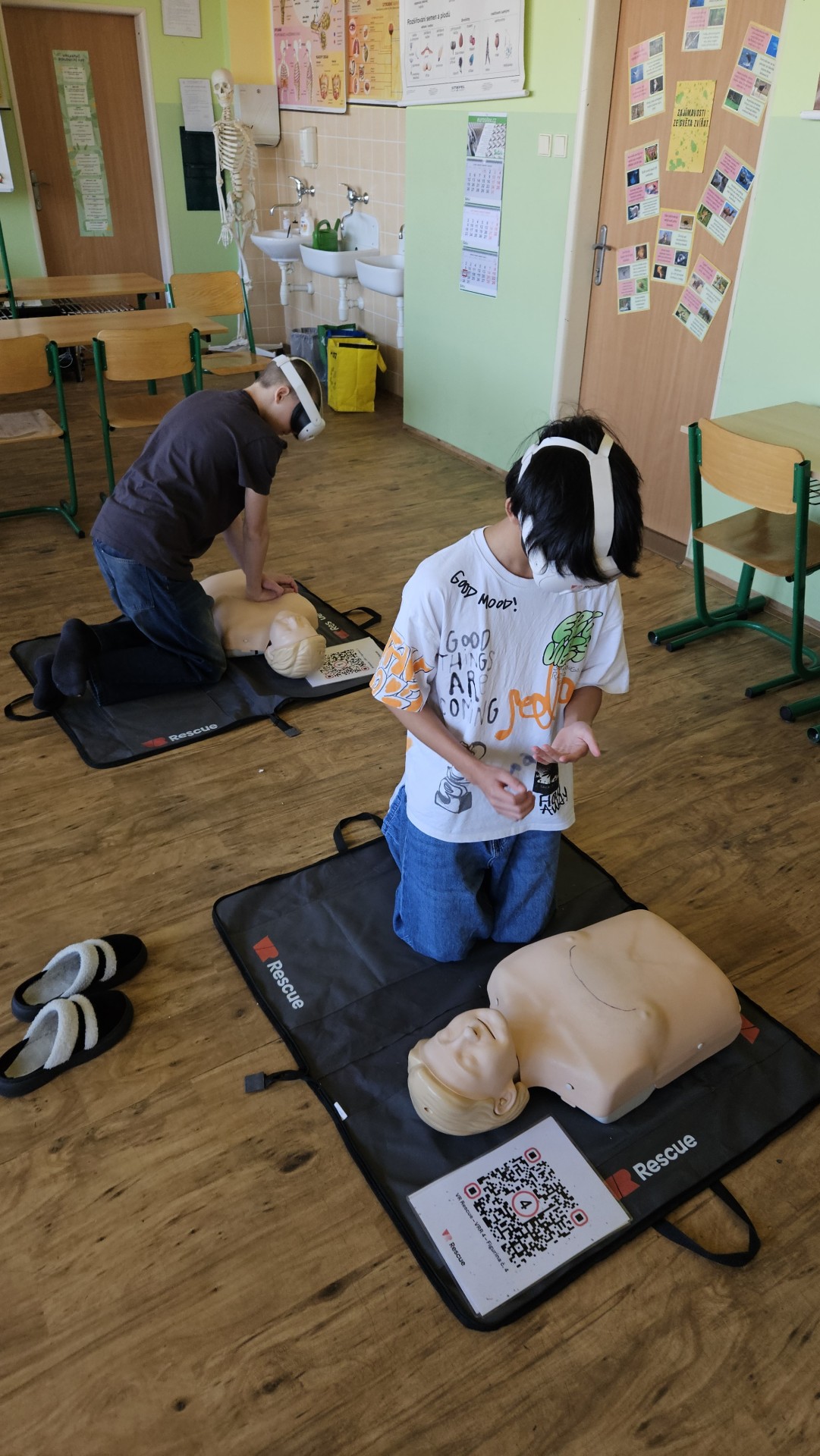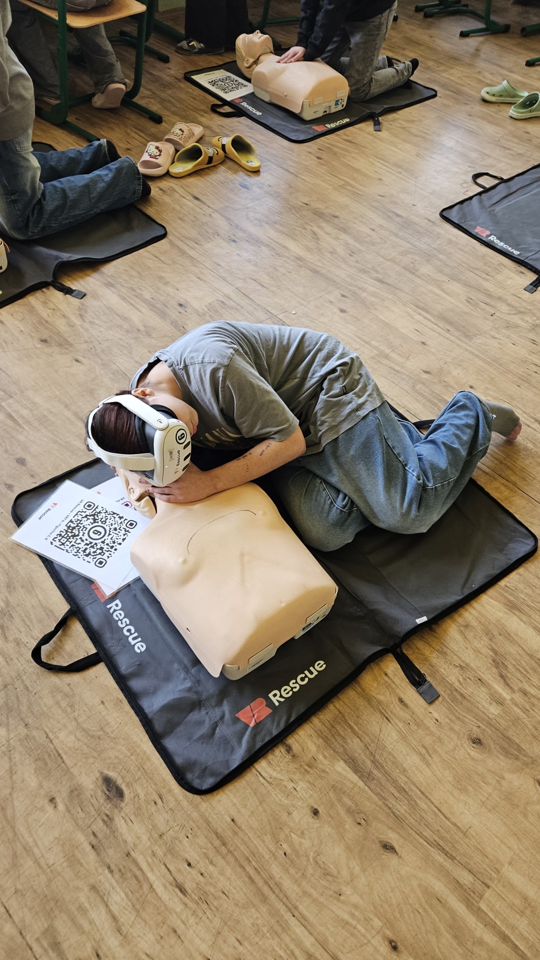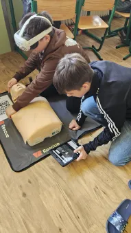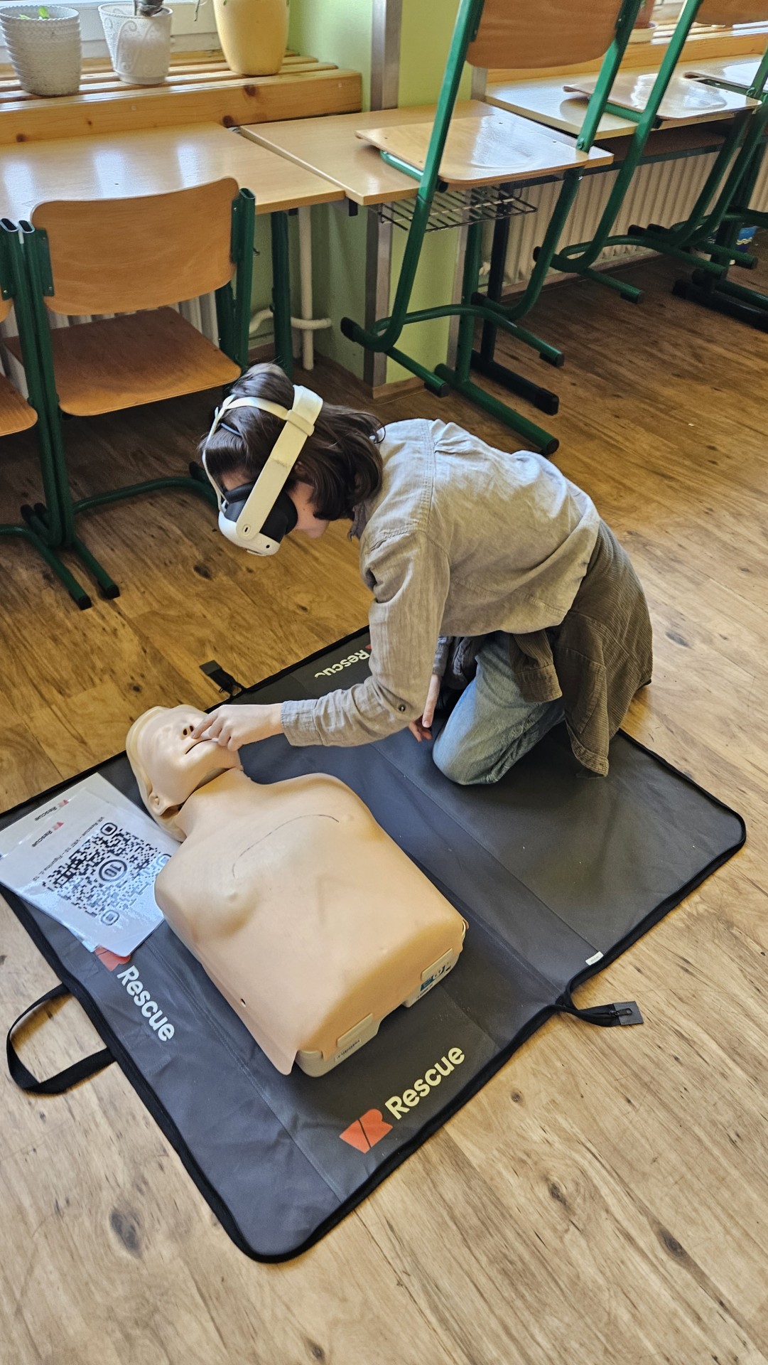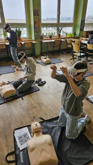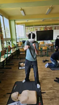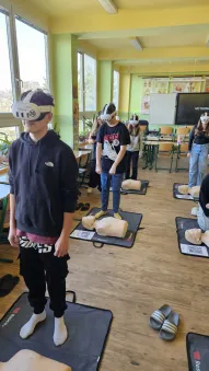 Vše začalo v plzeňském Centru robotiky, kde Mgr. David Šikel a Kateřina Košová prošli specializovaným školením. Naučili se zde, jak poskytovat první pomoc a nepřímou srdeční masáž na výcvikové figuríně s využitím brýlí pro virtuální realitu. Díky spolupráci se společností VR Rescue, která nám zapůjčila 2 sady VR brýlí (brýle na virtuální realitu) a 10 resuscitačních panen, jsme tento unikátní program mohli přinést přímo do naší školy.