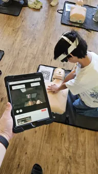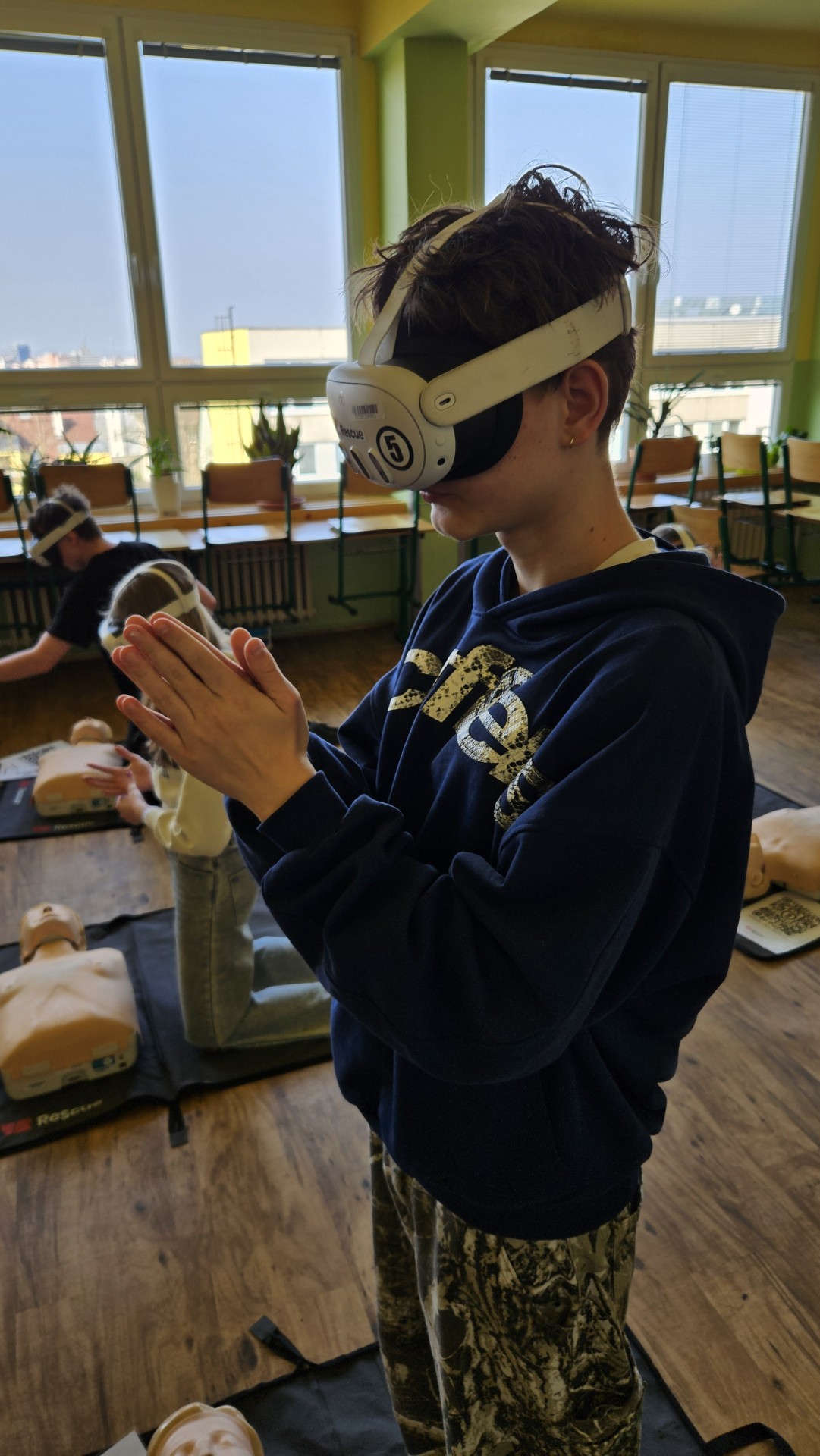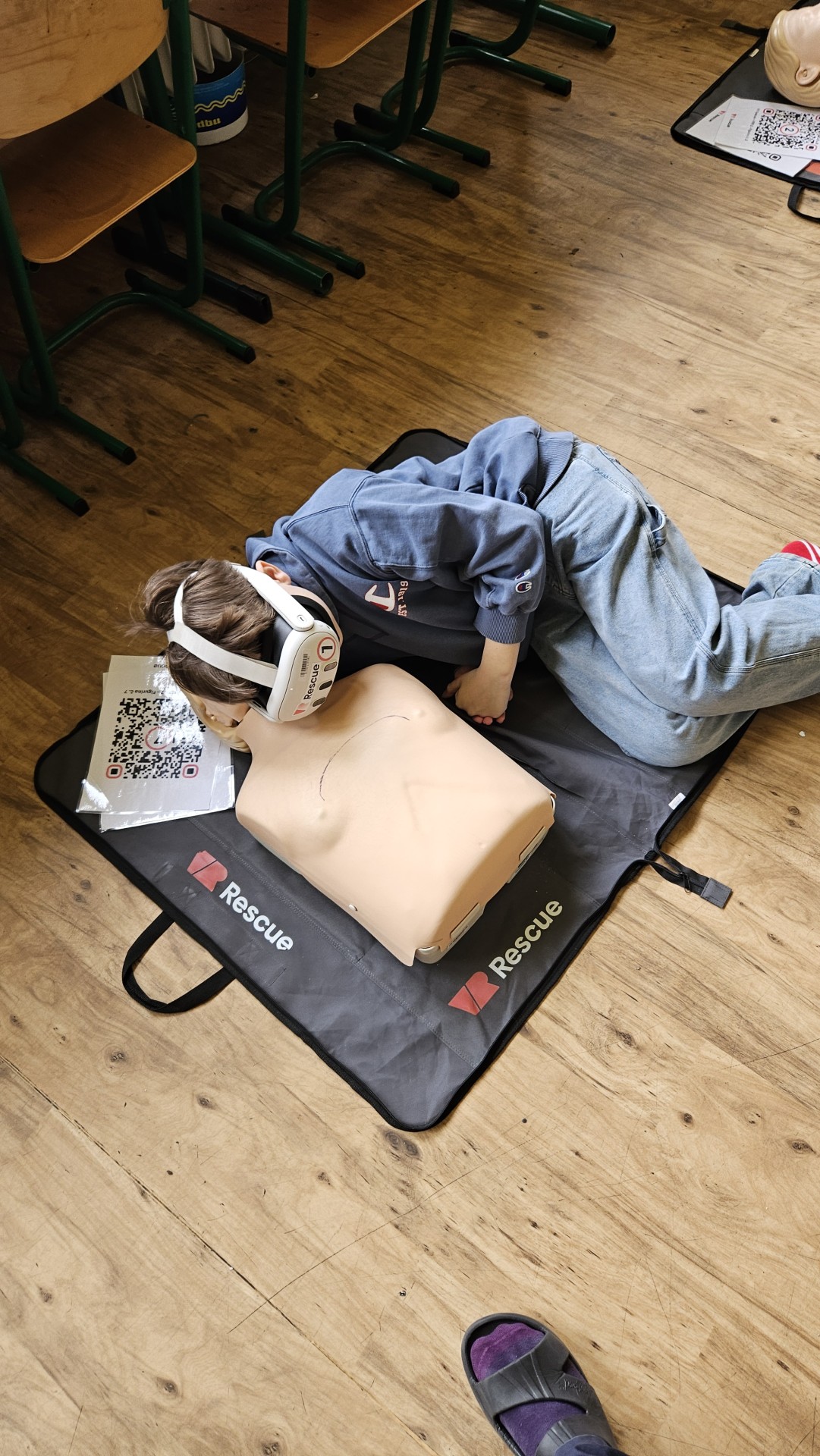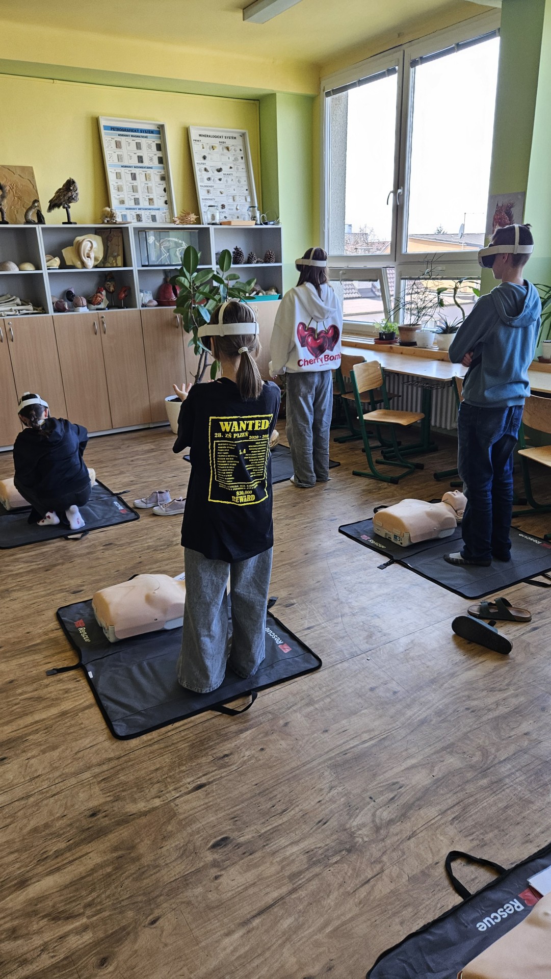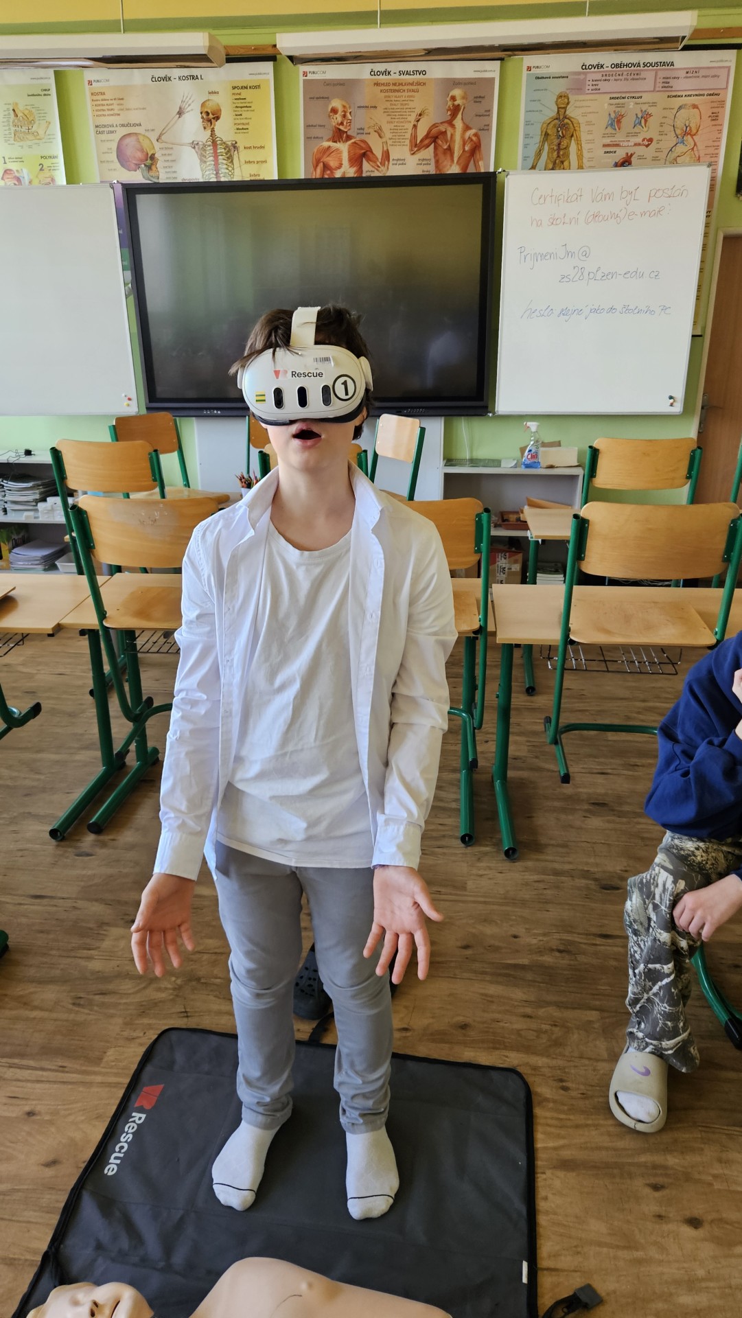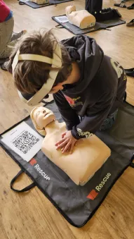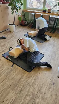 Vše začalo v plzeňském Centru robotiky, kde Mgr. David Šikel a Kateřina Košová prošli specializovaným školením. Naučili se zde, jak poskytovat první pomoc a nepřímou srdeční masáž na výcvikové figuríně s využitím brýlí pro virtuální realitu. Díky spolupráci se společností VR Rescue, která nám zapůjčila 2 sady VR brýlí (brýle na virtuální realitu) a 10 resuscitačních panen, jsme tento unikátní program mohli přinést přímo do naší školy.
